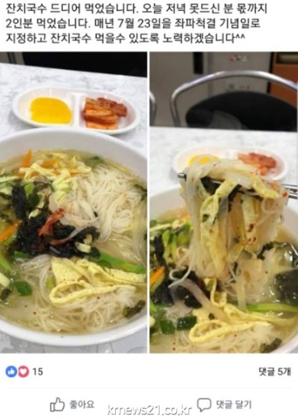 23일 저녁 조 대표의 보좌관 정 모 씨는 자신의 페이스북에 잔치국수 사진을 올리며 "드디어 먹었다. 오늘 저녁 못 드신 분 몫까지 2인분 먹었다. 내년 7월 23일을 좌파척결 기념일로 지정하고 잔치국수 먹을 수 있도록 노력하겠다"라고 글을 게재했다.
