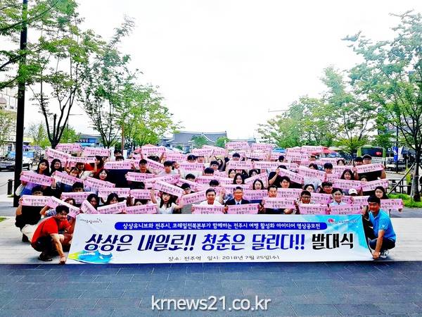 전주시와 코레일 전북본부, KT&G 상상유니브 전북 운영사무국에 따르면 전주지역 여행활성화를 위해 25일 전주역 앞 첫마중길에서 김승수 전주시장과 전국 대학생 100여 명이 참가한 가운데 ‘상상은 내일로, 청춘은 달린다’라는 주제로 전주여행 영상 공모전 발대식 및 전주여행 설명회를 열었다.