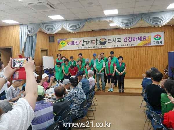 ▲ (사진=구리시청)구리시(시장 안승남) 동구동은 지난 7월 24일 동구동 주민센터 4층 대강당에서 동구동새마을부녀회 및 새마을지도자 주관으로 관내 저소득 독거노인 70여명을 초청해 삼계탕을 대접하는 시간을 가졌다.