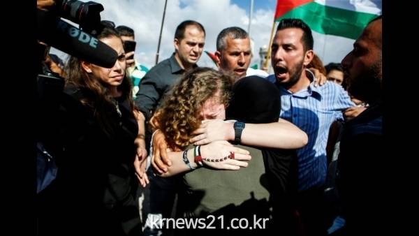 ▲ AFP / ABBAS MOMANI[제공자ⓒ 뉴스21통신. 무단전재-재배포 금지.]이스라엘군 병사의 뺨을 때리고 발길질을 하는 모습이 담긴 영상이 유포되면서 '팔레스타인 잔다르크'라는 별명이 붙은 아헤드 타미미(17)가 29일(현지시간) 만기 출소했다. 타미미는 지난해 12월 이스라엘 점령지 요르단강 서안지역에서 이스라엘군 병사 폭행 혐의로 구속기소됐다.