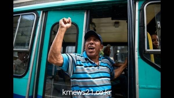 ▲ AFP / Federico PARRA[제공자ⓒ 뉴스21통신. 무단전재-재배포 금지.]베네수엘라 수도 카라카스에서 버스 운전사들이 차량 예비 부품 부족 등으로 정부에 항의하는 슬로건을 외치고 있다. 지난달 31일(현지시간)에는 카리카스의 80%에 달하는 정전 사태가 발생해 교통에 혼란을 겪기도 했다.