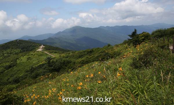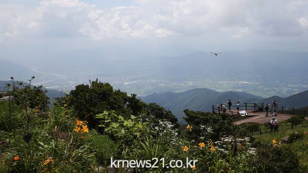 (해발 1,506m) 정상엔 하늘정원인듯 원추리꽃을 비롯한 동자꽃, 잔대, 모싯대 등 야생화가