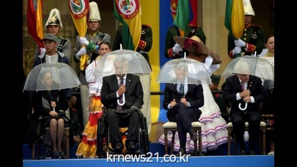 ▲  AFP / Raul ARBOLEDA[제공자ⓒ 뉴스21통신. 무단전재-재배포 금지.]7일(현지시간) 이반 두케 콜롬비아 대통령의 취임식이 볼리바르 광장에서 우천 속에 열렸다. 왼쪽 두번째부터 에콰도르 레닌 모레노 대통령, 아르헨티나 마우리시오 마크리 대통령, 칠레 세바스찬 피녜라 대통령이 우산을 쓰고 취임식에 참석하고 있다.