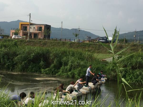 (전북/뉴스21) 정진환 기자 = 장수군 장계면(면장 이길재)은 지난 6일 장계면 장계리 장계천 일대에서 수중생태계 보전과 하천수질 개선을 위해 다슬기 치패 30만수 방류행사를 가졌다.