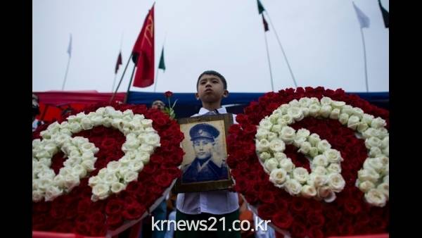 ▲  AFP / Ye Aung THU[제공자ⓒ 뉴스21통신. 무단전재-재배포 금지.]미얀마 1988년 민주화 운동 기념 행사에 한 학생이 아웅산 장군의 초상화를 들고있다. 이 민주화 운동은 미얀마에서 "8888" 운동로도 알려져 있다.