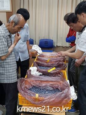 ▲ 국립원예특작과학원, 무주군, 블루베리 수확 후 관리기술 현장평가회(전북/뉴스21)송태규기자= 무주군은 지난 20일 설천면주민자체센터 2층 회의실(태권방)에서 포도 신품종 ‘진옥’ 판로확대를 위한 마케팅 지원 간담회 및 현장평가회를 가졌다고 밝혔다.