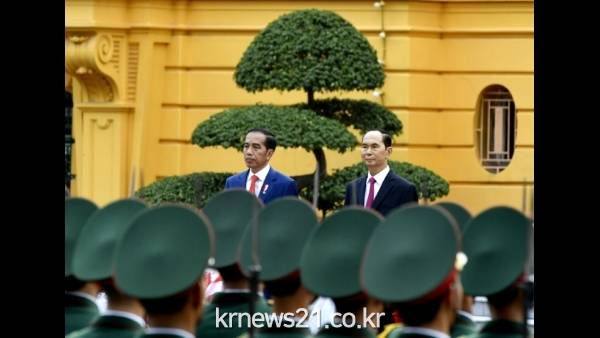 조코 위도도 인도네시아 대통령과 쩐다이꽝 베트남 국가주석이 11일(현지시간) 하노이 대통령 궁 앞에서 베트남 인민군 의장대를 사열하고 있다.