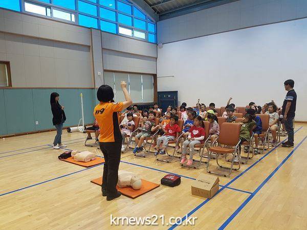 주요 내용으로 만화영화 시청을 통한 화재예방 교육, 심폐소생술 교육 및 실습, 소방펌프차 등 소방장비 소개 및 탑승체험, 마지막으로 물소화기 체험을 통해 아이들에게 안전역량을 강화하는데 노력하였다.