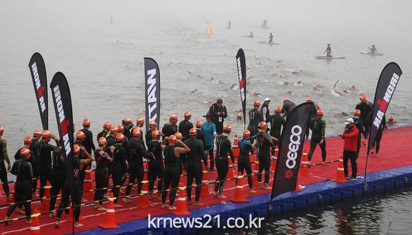 참가선수중 1,213명(완주율 89%)의 선수가 수영, 사이클, 마라톤 3개 종목 총 226km를