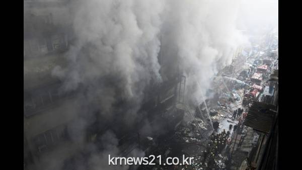 ▲   AFP / Dibyangshu SARKAR[제공자ⓒ 뉴스21통신. 무단전재-재배포 금지.]인도 콜카타의 바그리(Bagree)지역 시장에서 소방관들이 화재 진압을 하고 있다.