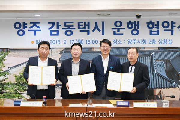 양주시(시장 이성호)는 지난 17일 시청 2층 상황실에서 경기도개인택시운송사업조합양주시조합, ㈜양주상운, ㈜한영 등 택시운송사업자와 감동택시 운행 협약식을 가졌다.