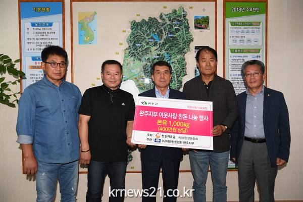 (전북/뉴스21)송태규기자= (사)대한한돈협회 완주지부(지부장)는 지난 19일 지역의 어려운 이웃들에게 전해달라며 돈육 1,000kg, 400만원 상당을 완주군에 전달했다. 대한한돈협회 완주지부는 지난 2014년부터 매년 완주군에 돈육과 성금 등을 기부해오고 있으며 올해에도 800만원이 넘는 성금과 후원물품을 완주군에 기탁했다.