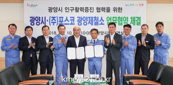 시는 10월 10일 시청 접견실에서 정현복 광양시장, 김학동 ㈜포스코 광양제철소장을 비롯한 관계자 10여 명이 참석한 가운데 인구활력증진 협력 업무협약을 체결했다고 밝혔다.