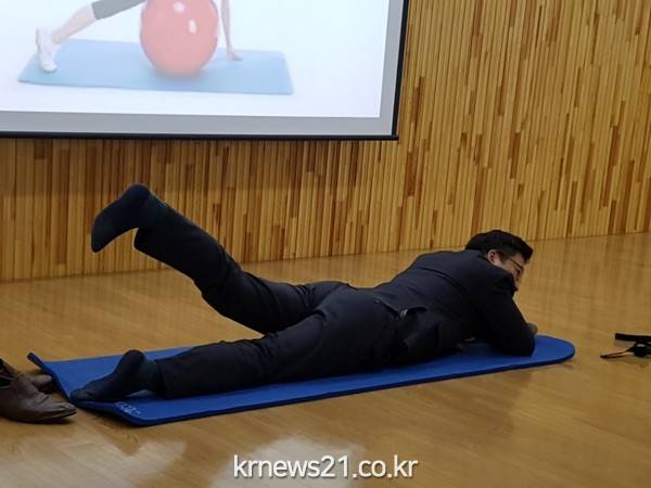 강사 최 규남 실장이 근골격계 및 척추관절 질환예방 에 대한 주제로 열심히 설명하고 있다