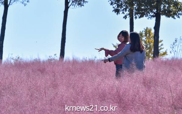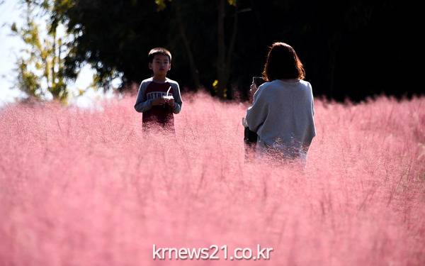△19일 오전 핑크 뮬리가 활짝 핀 여수 선사유적공원에서 한 여성이 아이의 사진을 찍고 있다.