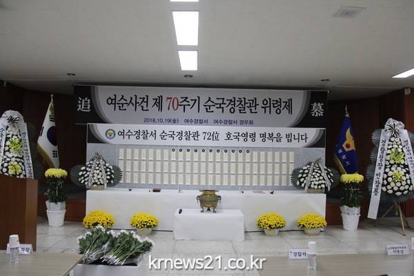 ❍ 19일 금요일 11시경 ‘제70주기 여순사건 순국경찰관 위령제’가 여수경찰서 3층 화합마루에서 주승용 국회부의장 및 김상철 여수경찰서장, 경찰서 기능별 과·계장, 지구대·파출소장, 재향 경우회 회원 및 순국 경찰 유가족 등 100여명이 참석한 가운데 거행됐다.