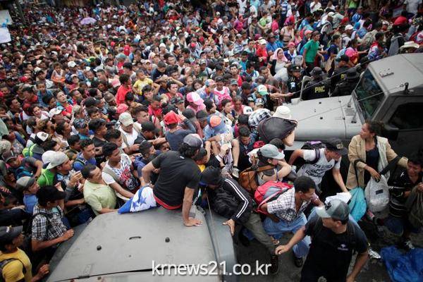 ▲  REUTERS/Ueslei Marcelino[제공자ⓒ 뉴스21통신. 무단전재-재배포 금지.]온두라스 등 중미에서 미국으로 향하는 이민자 행렬(캐러밴·Caravan) 일부가 19일(현지시간) 과테말라의 국경 검문소를 지나 멕시코로 향하고 있다.