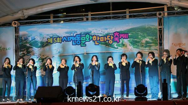 △지난 20일 여수시 시전동 주민자치위원회 프로그램 수강생들이 웅천친수공원 야외무대에서 열린 문화한마당 축제에서 하모니카 연주를 선보이고 있다.