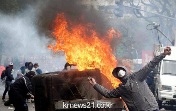 국제통화기금(IMF)의 구제금융을 지원받는 아르헨티나에서 25일(현지시간) 하원이 18시간의 논의 끝에 IMF가 요구한 긴축 방안이 담긴 예산안을 가결했다. 의회 밖에서는 긴축 방안 예산안에 반대하는 시위대가 돌을 던지고 있다.