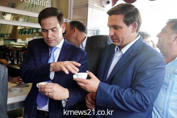 ▲  REUTERS/Carlo Allegri[제공자ⓒ 뉴스21통신. 무단전재-재배포 금지.]마르코 루비오 공화당 상원의원(오른쪽)이 1일(현지시간) 플로리다주 마이애미 리틀 하바나 지역의 베르사이유 레스토랑에서 론 드산시트 주지사 후보에게 커피를 건네고 있다.