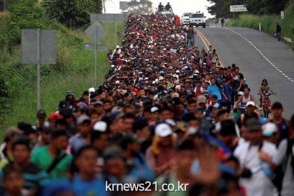 ▲   REUTERS/Carlos Garcia Rawlins[제공자ⓒ 뉴스21통신. 무단전재-재배포 금지.]2일(현지시간) 멕시코 타파출라 지역와 시우다드 이달고를 연결하는 도로에서 미국으로 향하는 캐러밴.