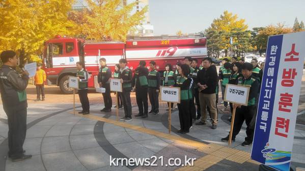 이날 훈련은 가상으로 화재발생 상황을 설정한 후 진행됐으며, 훈련에 참가한 직원들은 화재 조기진압을 위한 소화기 및 옥내 소화전 사용법, 근무자 대피요령, 완강기 사용법 등에 대해 교육을 받았다.