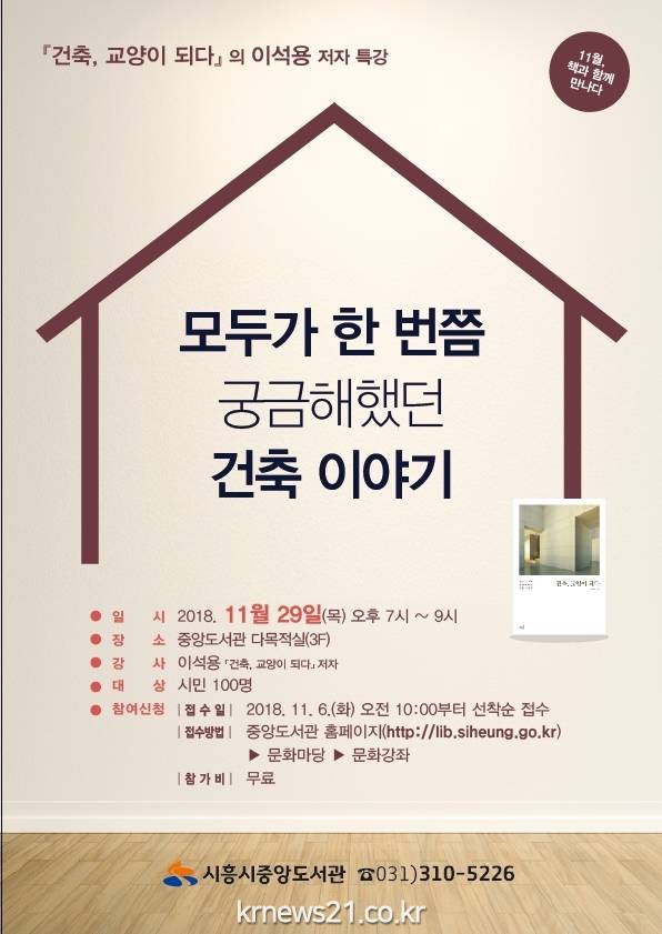 시흥시 중앙도서관에서는 오는 29일 저녁 7시 ‘모두가 한 번쯤 궁금해 했던 건축 이야기’라는 주제로 이석용 저자와의 만남을 개최한다.