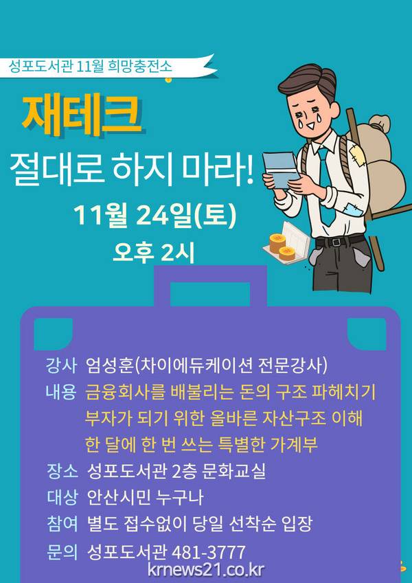 11월 희망충전소는 오는 24일 오후 2시 엄성훈 차이에듀케이션 전문강사를 초청해 ‘재테크 절대로 하지 마라!’라는 주제로 강연을 진행한다.