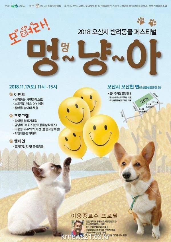 오산시 동물 사랑협회는 오는 17일 오산천 변에서 [모여라! 멍~냥~아]라는 슬로건으로 「2018 오산시 반려동물 페스티벌」을 개최한다고 밝혔다.