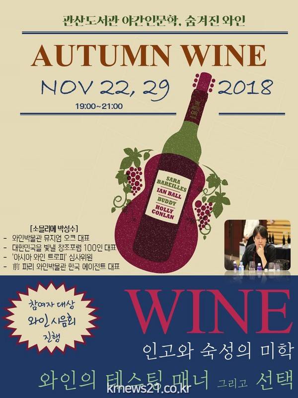 안산시 관산도서관(관장 이병호)은 오는 22일, 29일 저녁7시 ‘인고와 숙성의 미학, 와인’이라는 주제의 강연을 진행한다.