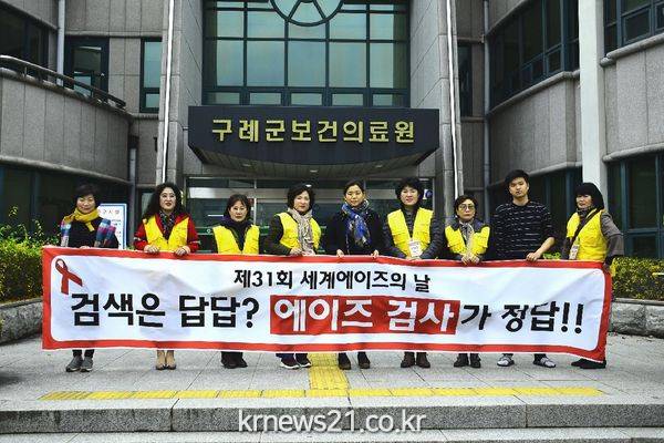 구례군(군수 김순호)은 에이즈 예방주간(12. 1. ~ 12. 7.)을 이용하여 「검색은 답답? 에이즈 검사가 정답!」이라는 슬로건을 내걸고 에이즈 감염인에 대한 편견과 차별해소를 위해