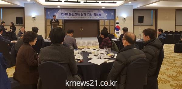 경기도는 지난 7일 의정부 아일랜드 캐슬 다이아몬드홀에서 ‘2018년 경기도 통일 교육 협력 강화 워크숍’을 도내 통일 교육업무 담당자, 유관단체 관계자, 전문가 등 50여 명이 참석한 가운데 개최했다고 밝혔다.