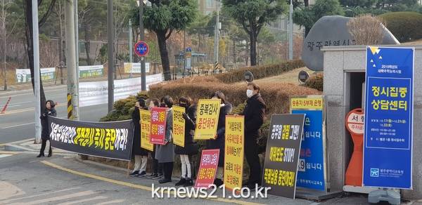 지난 12월 13일부터 한유총 광주지회는 중복감사, 표적감사, 감사관의 직권남용에 항의하며 광주시교육청에서 천막농성에 돌입하였다. 천막농성을 시작하자마자 전교조, 교사노조, 광주여성회 등 광주지역 일부 교원단체와 시민단체는 성명서와 시위, 각종 현수막을 내걸면서 광주지회의 천막시위 비난에 열을 올리고 있다. 이들의 주장은 두 가지이다. 첫째 한유총은 현행 교육청 감사를 받아들이고, 둘째 천막농성을 당장 철회하라는 것이다.