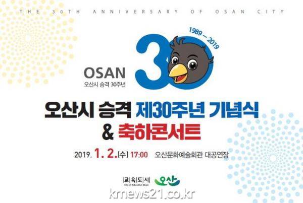 시는 1989년 1월 1일에 오산읍에서 오산시로 승격되어 2019년은 시로 승격한 지 30주년을 맞는 해이다. 시는 뜻깊은 시 승격 30주년을 경축하기 위한 기념식과 축하콘서트를 개최하여 오산시가 전국 최고 수준의 교육도시, 선진 복지 도시로 성장하였음을 선포하고 시민들의 자긍심을 높일 수 있는 계기를 마련한다.