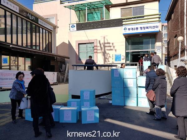 50박스를 부개3동 행정복지센타와 재활센타등 몇몇의 센타에 기부 하였다