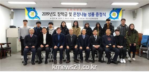 한려동에 따르면 지난 30일 동 주민센터 회의실에서 자생단체장과 주민 등 70여 명이 참석한 가운데 공화번영회 장학금 및 온정나눔 성품 증정식이 열렸다.