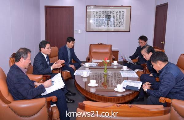 △ 지난 11일 대전 한국수자원공사를 방문한 권오봉 여수시장(좌측 가운데)이 이학수 한국수자원공사 사장(우측 가운데)에게 여수국가산단 공업용수 확보를 요청하고 있다.