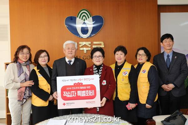 (전북/뉴스21)송태규기자= 무주군은 지난 11일 대한적십자사 전북지사 측에 적십자특별회비를 전달하며 인도주의 정신을 앞세운 적십자 운동에 동참했다. 무주군청에서 진행된 이날 전달식에는 황인홍 무주군수와 대한적십자사 전북지사 고경숙 부회장을 비롯한 관계자 등이 함께 해 특별회비와 특별회원증 등을 교환하며 이 자리의 의미를 더했다. 고경숙 부회장은 “생명보호와 재난대비에 동참해준 무주군 측에 깊은 감사를 드린다”라며 “오늘을 계기로 적십자 활동이 더 많이 알려져서 나눔의 손길도 더 많아지길 바란다”라고 전했다.