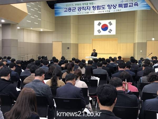 고흥군(군수 송귀근)은 지난 18일 군청 우주홀에서 부서장, 군청 담당급 및 공사, 보조금, 인·허가 업무 담당자 등 200여명을 대상으로「민선7기 변화와 개혁을 위한 청렴도 향상 특별교육」을 실시하였다.