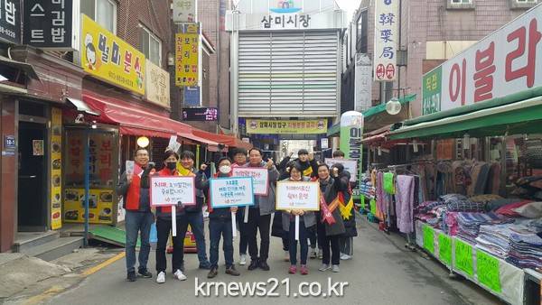 시흥시 치매 안심 센터에서는 20일 신천동 삼미시장 일원에서 신천고등학교 치매 파트너 학생들과 이마트 물류센터 시화점 직원들과 함께 시장상인 및 지역 주민 대상으로 캠페인을 펼쳤다.