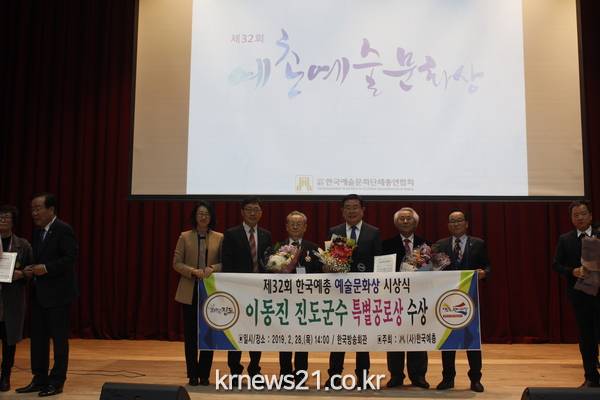 이번 제32회 한국예총예술문화상 시상식은 (사)한국예술문화총연합회(한국예총) 주관으로 이동진 진도군수를 비롯한 10개 회원협회장 등 관계자 300여명이 참석한 가운데 서울 한국방송회관 코바코홀에서 열렸다.