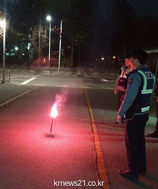 이재술 시흥경찰서장은 "불꽃신호기는 야간 교통사고 현장에서 후행 차량 운전자 들에게 사고를
