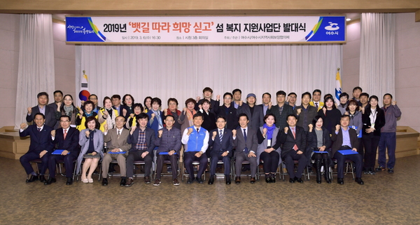 여수시, 2019년 섬 복지 지원사업단 발대식 열려 △ 지난 6일 오후 시청 회의실에서 권오봉 여수시장 등 30여 명이 참석한 가운데 2019년 ‘뱃길 따라 희망 싣고’ 섬 복지 지원사업단 발대식이 열렸다. 사업단은 소규모 16개 도서 섬 주민 600여 명을 대상으로 주거환경개선, 밑반찬, 말벗지원, 의료·보건, 가스·전기 안전 점검 등 다양한 복지서비스를 제공할 예정이다.