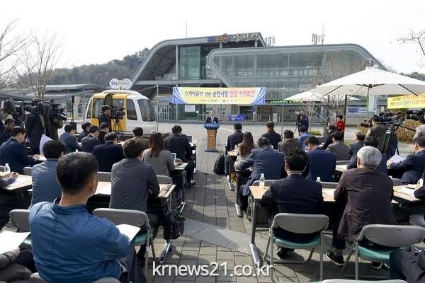 허석 순천시장은 18일 순천만국가정원에서 포스코의 스카이큐브(PRT) 일방적 협약 해지와 순천시민을 상대로 1367억원의 보상 청구에 대한 긴급 기자회견을 가졌다.