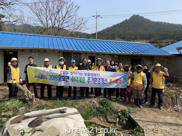 진도군 임회면 공무원 청우회원과 진도군장애인종합복지관 봉사단체인 진도군 행정동우회, 전남자원봉사센터 등 30여명이 주거환경개선 대상 가구인 임모(임회면) 씨의 주거환경개선을 위해 청소 봉사활동을 실시했다.