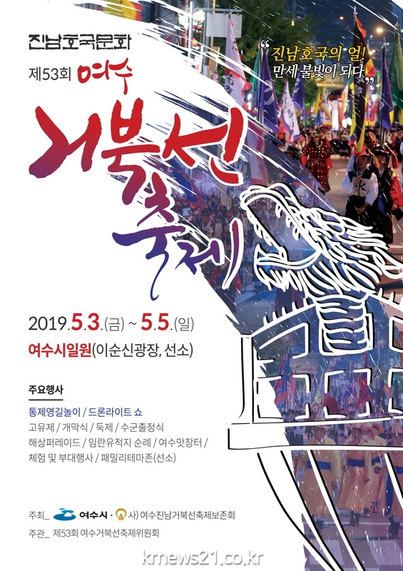 2019년 문화관광 육성축제이자 전라남도 대표축제인 ‘제53회 여수거북선축제’는 오는 5월 3일부터 5일까지 이순신광장과 선소 일원에서 ‘진남호국의 얼, 만세 불빛이 되다’라는 주제로 펼쳐진다.