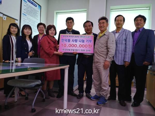 ▲ 지난 8일 ㈜신대보건설(대표 엄성기‧엄상호‧김귀숙)이 소외계층을 위해 써달라며 여수시 만덕동 지역사회보장협의체에 1000만 원을 기부했다.