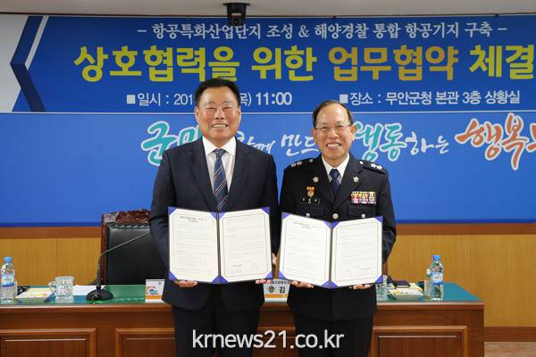 서해지방해양경찰청(청장 김병로)과 무안군(군수 김산)이 9일 ‘해양경찰 통합 항공기지 구축 및 항공특화산업단지’ 조성을 위한 업무협약(MOU)을 체결했다.