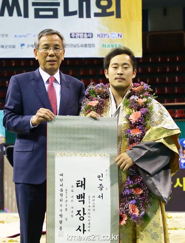 에서 의성군청소속 윤필재선수가 태백장사에 등극하여 최정희 구례부군수로부터 인증서