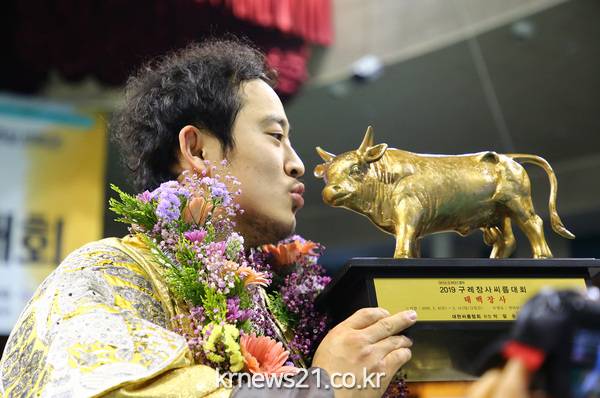 우승 감격에 황소트로피와 입마춤하고 있는 태백장사 윤필재 선수.